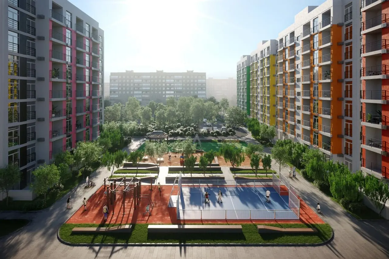 The residential complex is located in a quiet suburban district. Among its key features is a thoughtfully designed, fully enclosed courtyard where cars are not allowed, creating a safe and peaceful environment for residents.